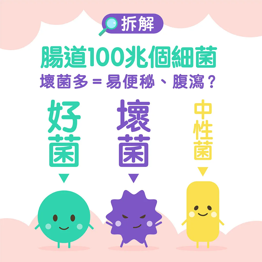 沙門氏桿菌、金黃葡萄球菌、大腸桿菌等都是「腸道菌群」裡的壞蛋,於代謝時會產生有害毒素,容易造成便秘、腹瀉、發炎等腸道問題,對健康構成影響。