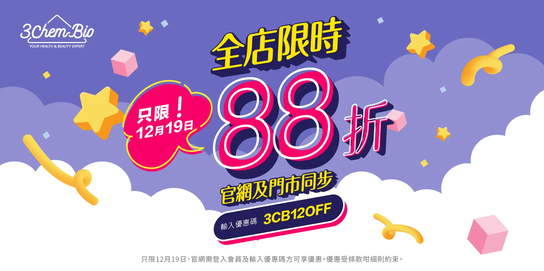 3. 優惠同時適用於3ChemBio官網、手機應用程式、3ChemBio 及 BIPO 門市。