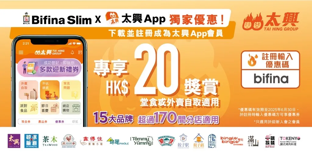 森下仁丹 Bifina Slim X Tai Hing 送您15大餐飲品牌$20優惠券🎁