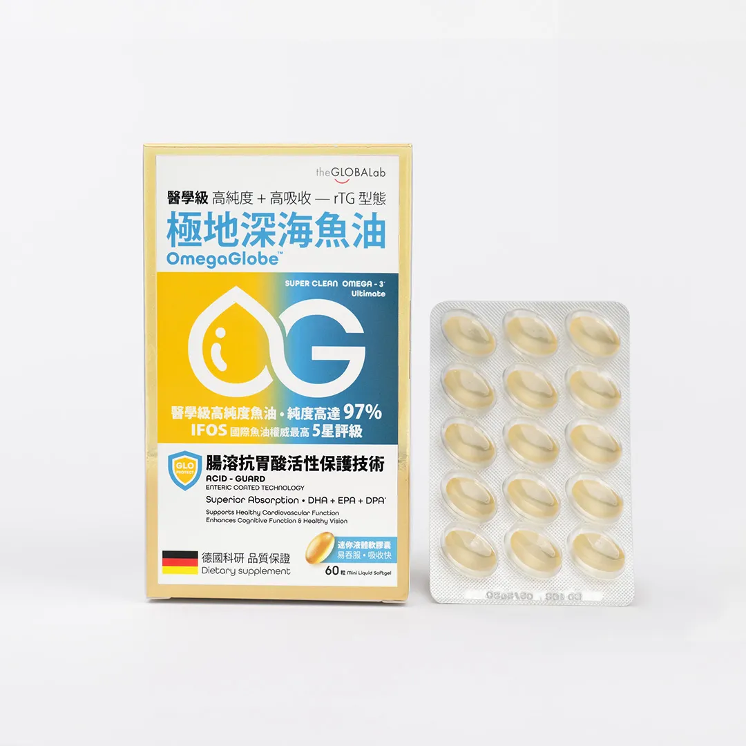 OmegaGlobe極地深海魚油 97% 採用歐洲製藥規格 GMP 生產及IFOS 國際魚油業權威5星認證 Omega-3。