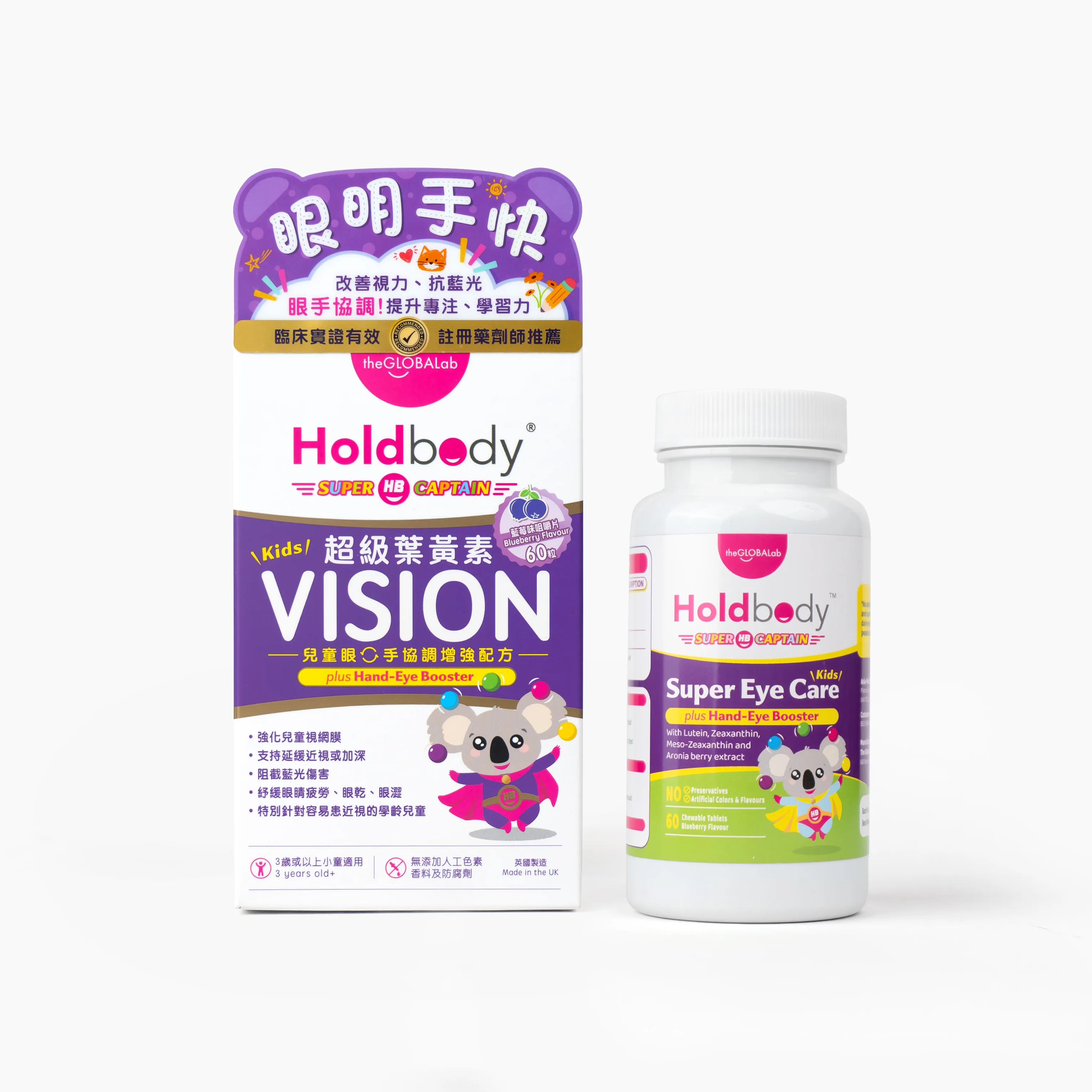 Holdbody Super Captain系列的 Super Eye Care 兒童超級葉黃素 — 採用 EyeSpeed Pro 醫學級配方,含專利Lutemax 2020®萬壽菊萃取物及北歐野櫻莓萃取,特別針對幼童及學童視網膜及視覺神經發展,藍莓口味更易服用。