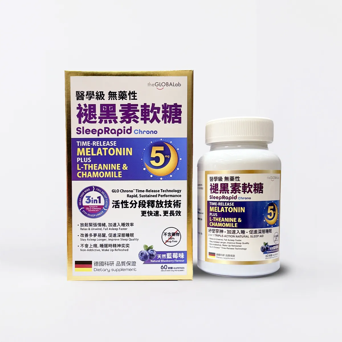 3大活性成分—褪黑素(Melatonin5mg)、洋甘菊(Chamomile)及茶胺酸(L-Theanine),發揮「協同效應」,透過 GLO Chrono™ Time-Release Technology專利分段釋放技術一