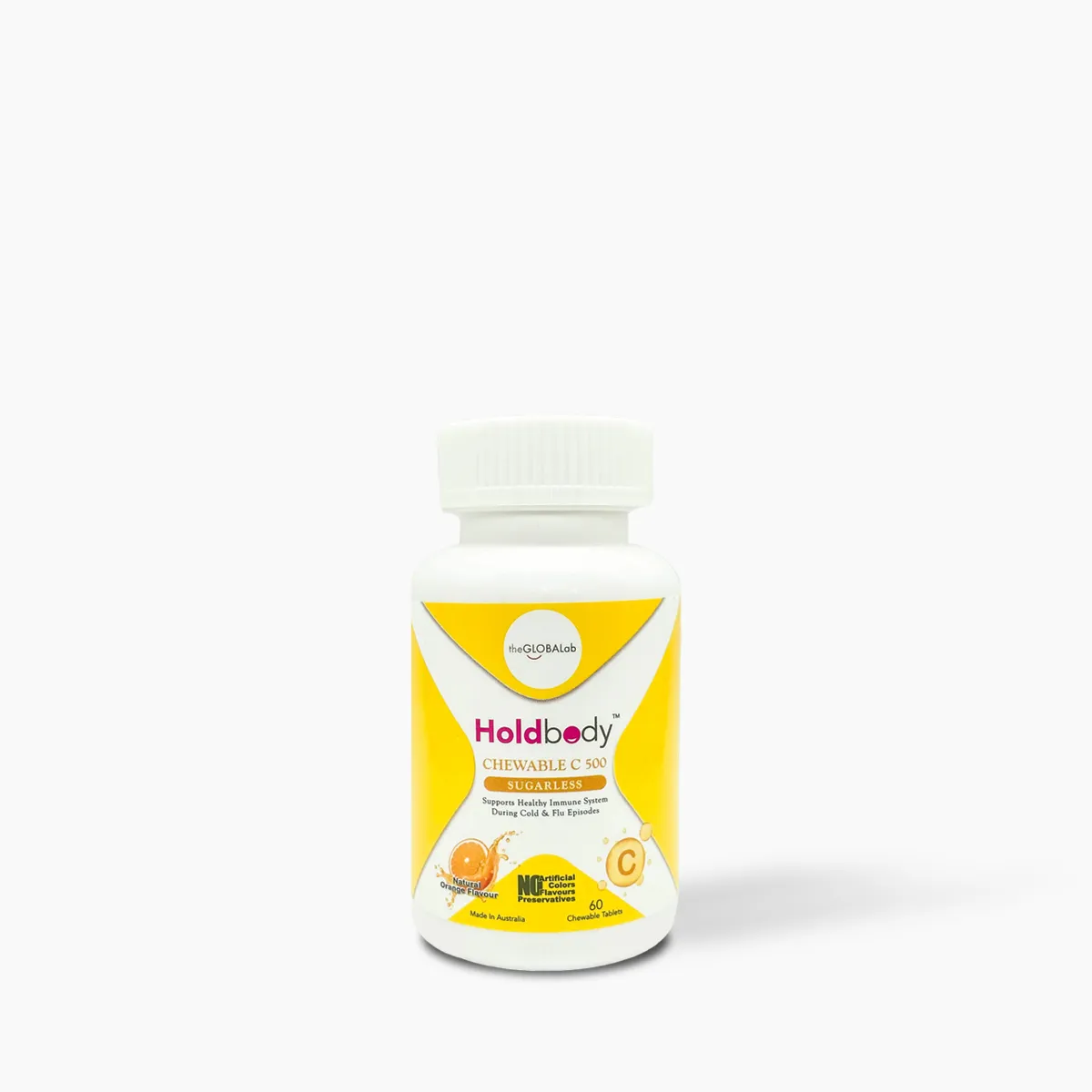 Holdbody 天然「無糖」 (SUGARLESS) 維他命C 咀嚼片,每粒含豐富維他命C 500mg,天然鮮橙味,絕無添加人造色素,無防腐劑,可直接咀嚼食用,無糖成份令大人小朋友更放心。