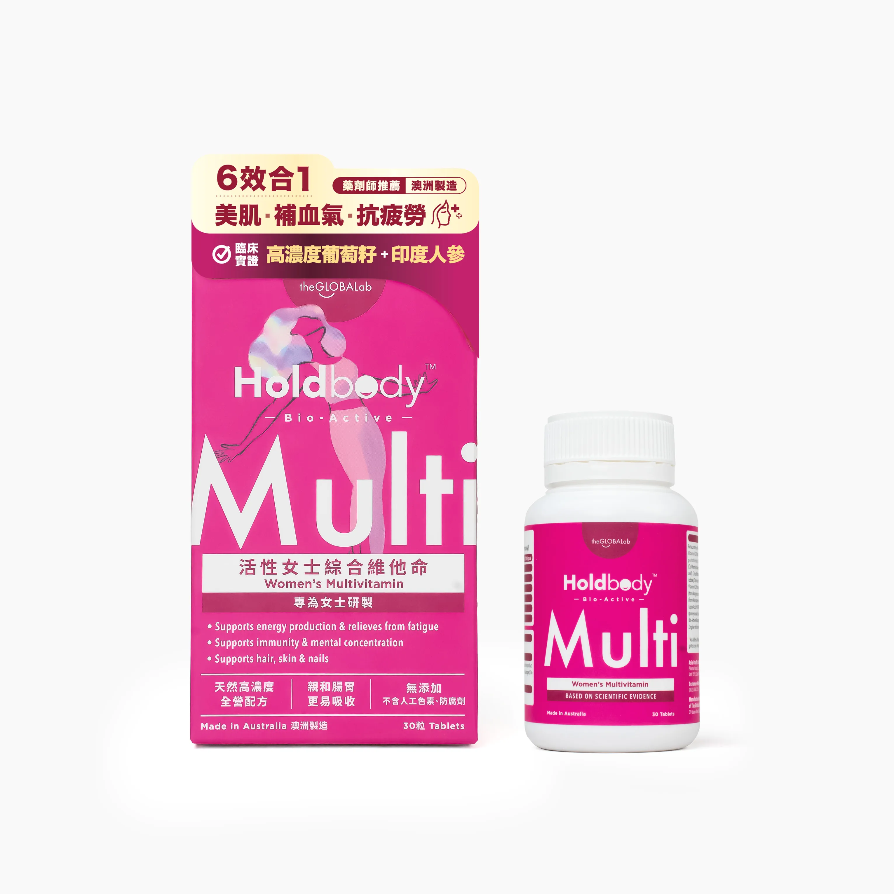 由藥劑師研發的 Holdbody Bio-Active 活性女士綜合維他命 - 透過獨有「OPTI 100 System 高效營養優化系統」提供多種維他命、礦物質、抗氧化成分及天然草本活性成分,為女士全面補充各種營養所需。