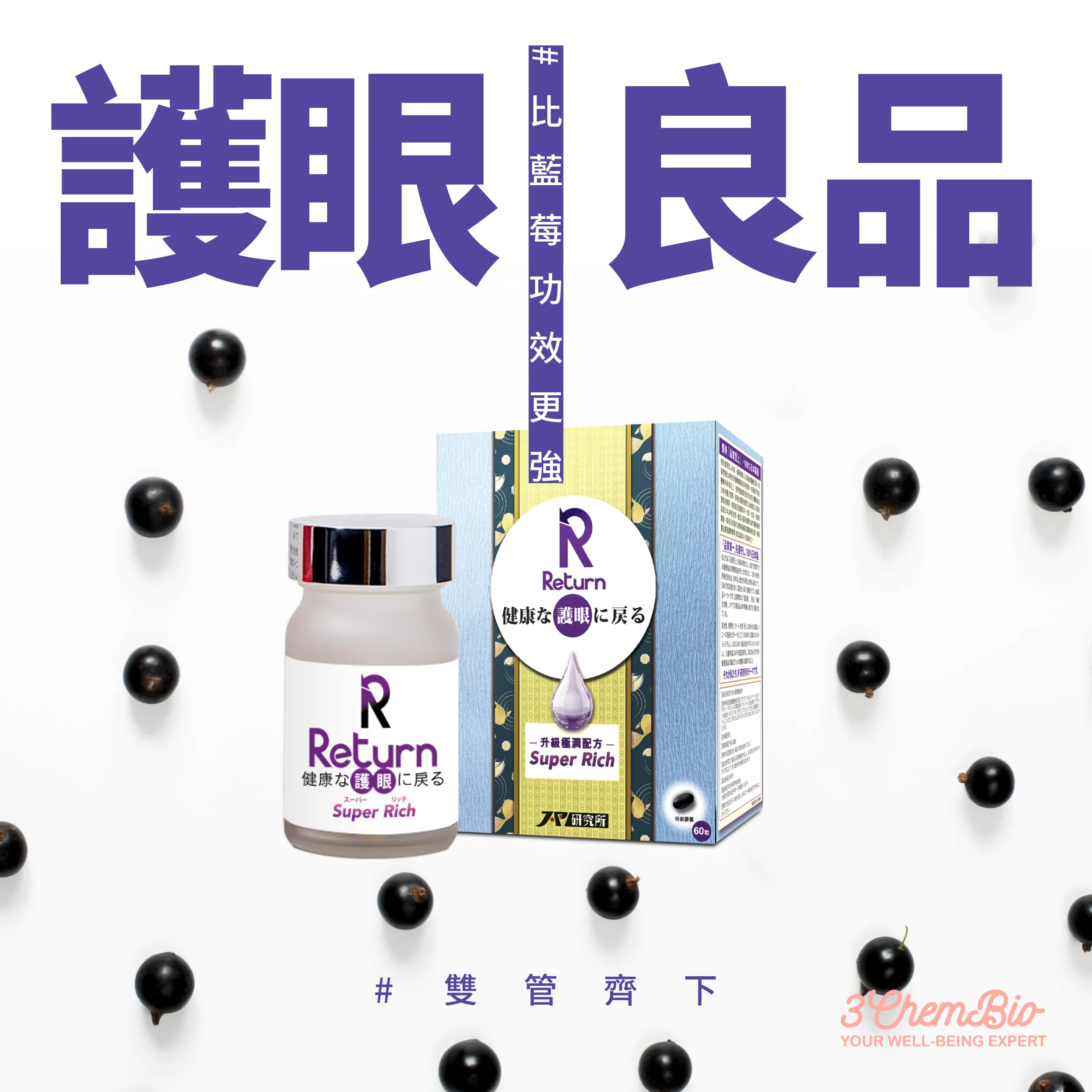 解決する! 乾澀紅筋、老花、藍光傷害、焦點調節退化 根據日本JP研究所最新發表的 VISION (目の疲労感の緩和に) 研究報告: 1) 攝取北歐藍莓中的C3G花青素,促進視網膜視紫質(rhodopsin)組成,是清晰視力的關鍵,有效改善調節機能、舒緩眼睛疲勞、眼乾及紅筋情況。2) 葉黃素能中和藍光及UV有害光線,是視網膜黃斑中不可缺少的色素。隨著年齡增長,葉黃素不斷下降,人體無法自行製造,必須從補充食品中攝取。